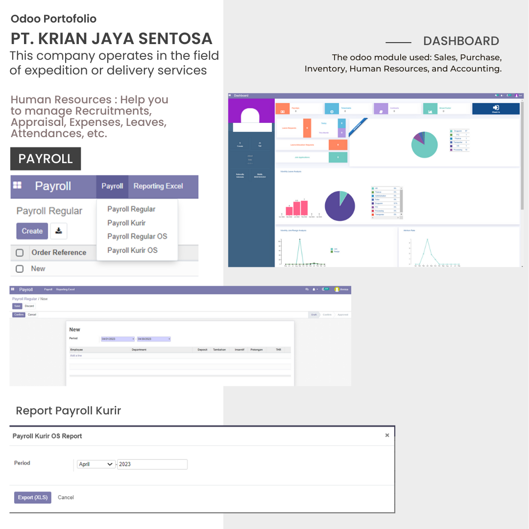 PT. Krian Jaya Sentosa, this company operates in the field of expedition or delivery services. The payroll module is one of the most advanced applications in Odoo that is filled with advanced features and tools for efficient payroll management. The module is integrated into other HR modules of Odoo, making it easy to use and highly efficient.
