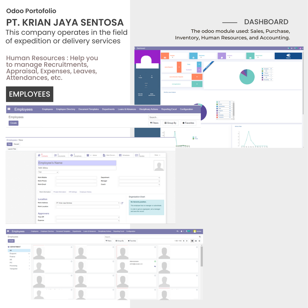 PT. Krian Jaya Sentosa, this company operates in the field of expedition or delivery services. The employees module can manage all your HR information. Oversee all important information for each department and you can Receive alerts for any new leave requests, allocation requests, applications, appraisals, and more.